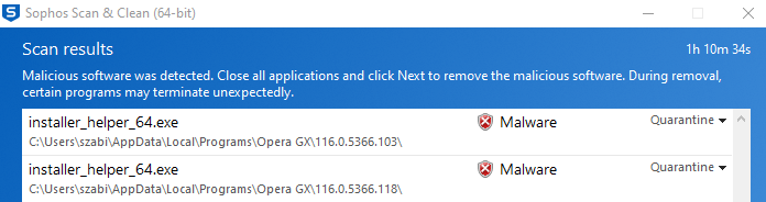 I did scan of my computer with Sophos Scan & Clean and it flagged two of Opera GX files as malware. I attached photos. Should I be worried? Anybody ever saw installer_helper_64.exe flagged as malware?